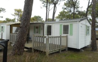 Mobil-Home 4/6 places comprenant 2 chambres séparées (1 chambre avec 1 lit 2 places et 1 chambre avec 2 lits 1 place), un salon / salle à manger avec une banquette transformable en lit double, salle de bain avec douche et lavabo, WC séparé, coin cuisine (avec gaz) et terrasse semi-couverte.