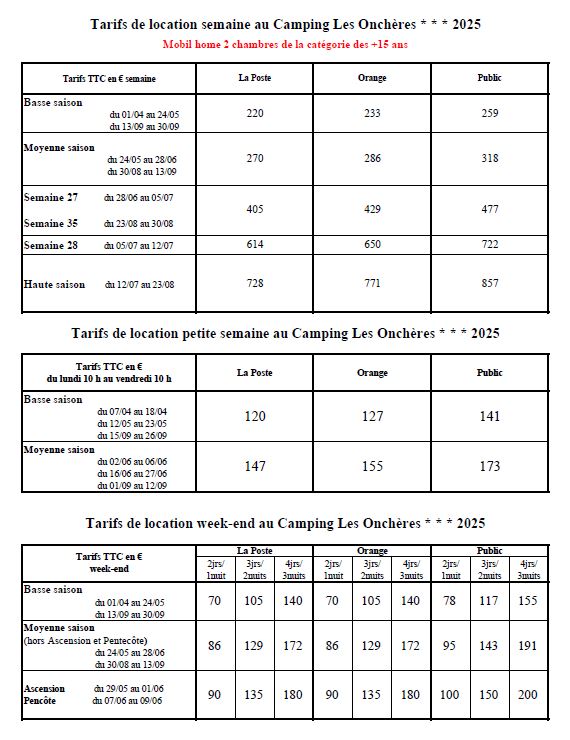 Dans un cadre agréable de 10 hectares, le Camping «Les Onchères», vous accueille du 1er Avril au 30 Septembre, avec son accès direct à la plage, sa piscine (pataugeoire, toboggan, bassin à contre-courant et grand bassin) ouverte et chauffée en moyenne et haute saison, mais aussi ses aires de jeux pour enfants, accès handicapé.
